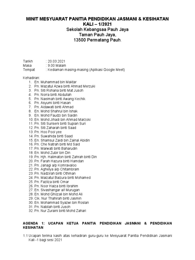 Minit Mesyuarat Panitia Pendidikan Jasmani Kesihatan Kali 1 2021 Pdf