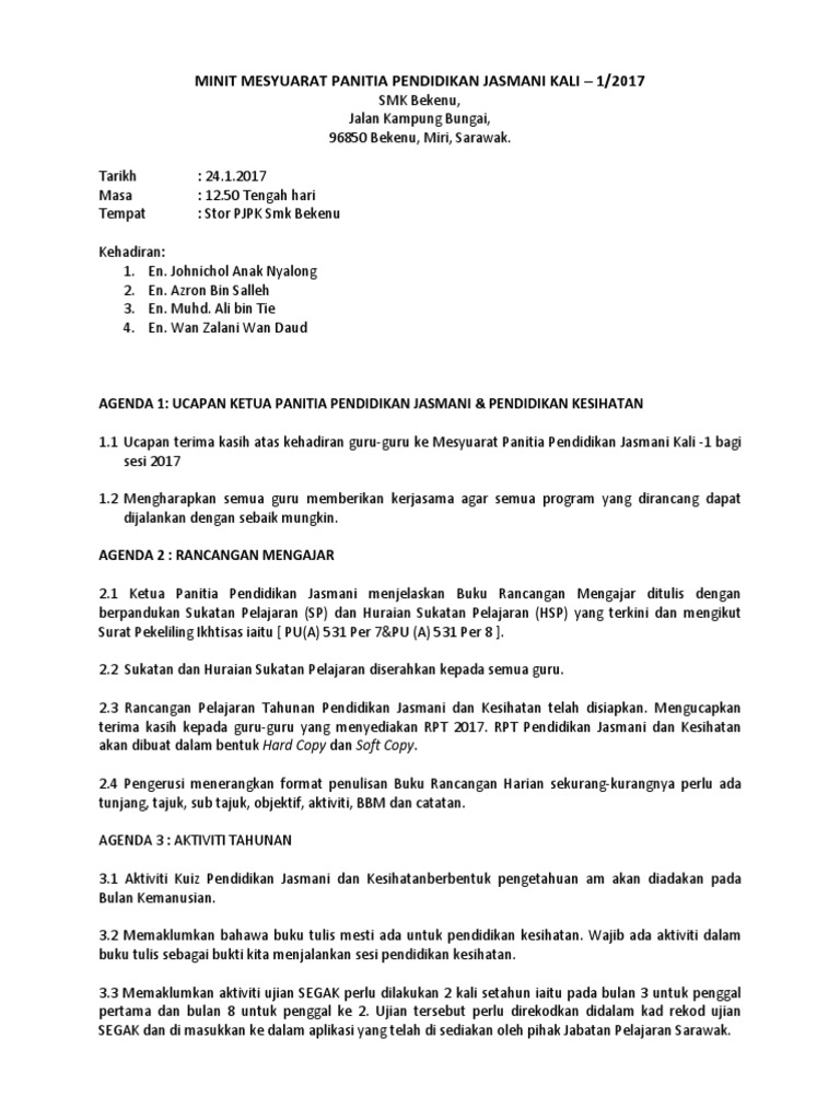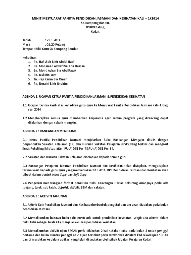 Minit Mesyuarat Panitia Pendidikan Jasmani Kali 1 Pdf